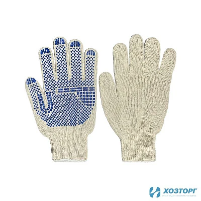 Перчатки ХБ с ПВХ 7,5 класс 4-нитка Белые синяя точка цена за пару (10/500)