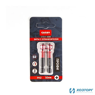 Биты с ограничителем СИЛАЧ ПРОФИ 50РН2, сталь S2, длина 50 мм, магнитные, 2шт/уп, цена за блистер (60/600)