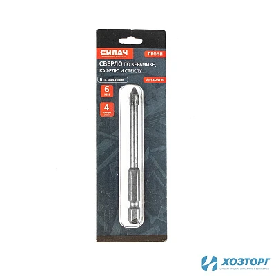 Сверло по керамике, кафелю и стеклу 6 мм, с четырьмя режущими лезвиями, 6гр хвостовик (в блистере) СИЛАЧ ПРОФИ (20/200)